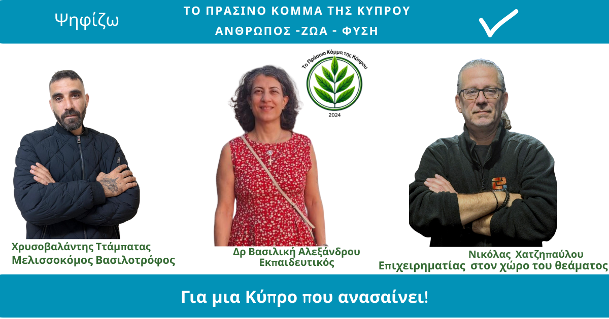 To Πράσινο Κόμμα της Κύπρου είναι ένα νέο κόμμα στην Κύπρο που στοχεύει σε μια Κύπρο που ανασαίνει κυριολεκτικά και μεταφορικά! Δεν σχετίζεται με το κίνημα Οικολόγων και πρεσβεύει μια πιο σύγχρονη άποψη για την οικολογία όπου η ποιότητα ζωής όλων είναι στο επίκεντρο της νέας αυτής πολιτικής! Λαμβάνοντας υπόψη τις πολλαπλές και αλληλένδετες κρίσεις που αντιμετωπίζουμε σήμερα και την ανεπάρκεια των παραδοσιακών κομμάτων να προστατέψουν αποτελεσματικά το περιβάλλον και να επιλύσουν την πληθώρα των προβλημάτων που ταλανίζουν τον άνθρωπο και την κοινωνία,αποφασίσαμε την ίδρυση του Πράσινου Κόμματος . Ως εκ τούτου, εκθέτουμε το όραμά μας για ένα καλύτερο αύριο και τη μεταστροφή της κοινωνίας μας σε όλα τα επίπεδα. Από την αρχή του πολιτικού μας ταξιδιού, δηλώνουμε ότι στόχος μας είναι ένα πιο δίκαιο και βιώσιμο μέλλον για όλους. Θέλουμε να προστατεύσουμε τη φύση, το κλίμα και την ποιότητα ζωής των ανθρώπων. Αγωνιζόμαστε ακόμα για την προστασία της δημοκρατίας, των ανθρωπίνων δικαιωμάτων και των πολιτικών ελευθεριών. Εργαζόμαστε για ίσα δικαιώματα, αξιοπρεπείς θέσεις εργασίας για όλους, ανθεκτικά και υγιεινά συστήματα διατροφής, βιώσιμες πόλεις, μια κυκλική οικονομία καθώς και μια ευημερούσα Κύπρο.